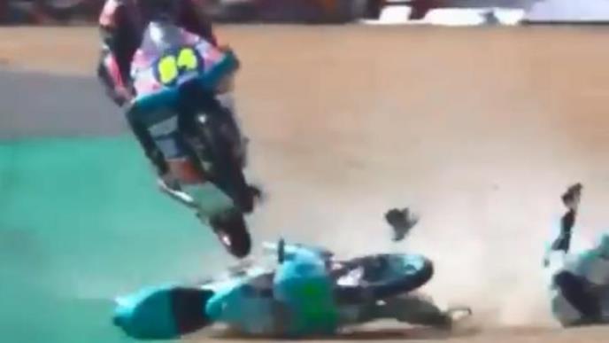 Italijanski vozač Enea Bastianini je proklizao u jednoj krivini, a samo sekund kasnije na njegov motor je naleteo Čeh Jakub Kronfeil i tom prilikom izveo spektakularan skok. Zahvaljujući neverovatnoj snalažljivosti i spretnosti ovaj 25-godišnjak se spasao.