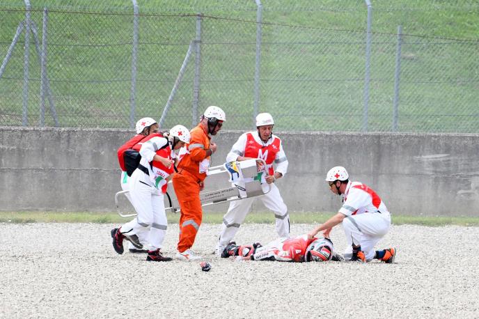 Test vozač Dukatija Mikele Piro je pri velikoj brzini izgubio kontrolu nad motorom, bukvalno poleteo sa motora, pao, zatim klizao desetinama metara, dok se nije zaustavio i ostao nepomično da leži.