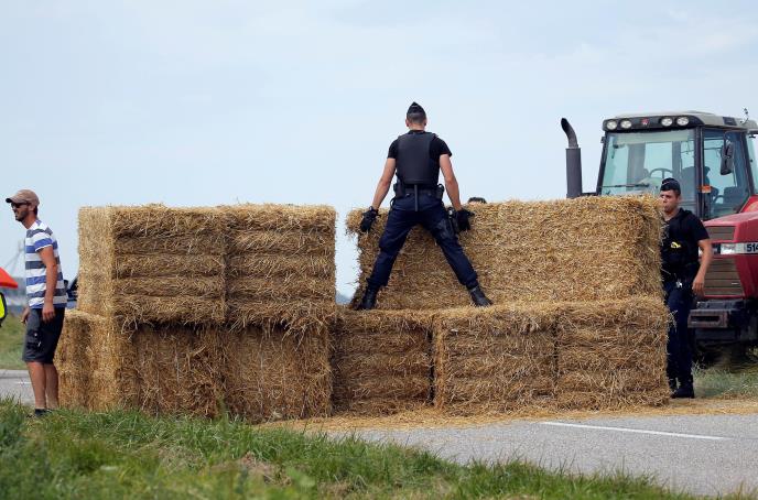 Poljoprivrednici su blokirali balama sena put kojim su trebali da prođu biciklisti. Želeli su da iskoriste trku kako bi iskazali svoje nezadovoljstvo jer im kasne finansijski podsticaji.