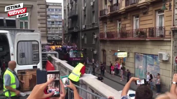VATERPOLISTI SPREMNI ZA DOČEK: Zlatni Delfini u otvorenom autobusu stigli na plato ispred Skupštine grada (KURIR TV)