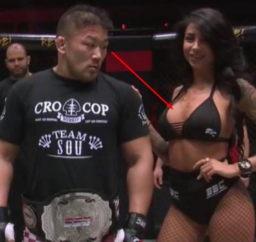 Naime, čini se da japancu pojas ipak nije bio na prvom mestu, mnogo zanimljivija mu je bila ring devojka iz Srbije, pa mu je pogled pobegao ka njenom bujnom dekolteu.
