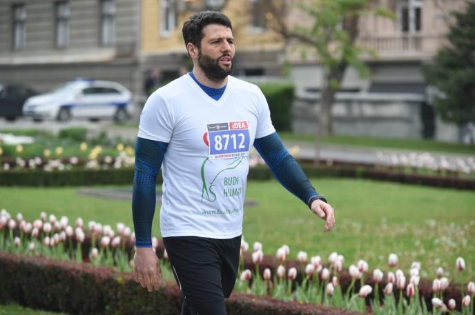 U sportskoj opremi, s ispisanom reklamom svoje humanitarne fondacije "Budi human" pojavio se sa svojom trkačkom ekipom i spremno krenuo u Trku zadovoljstva, da bi zatim istrčao 1 sat i 54 minuta bez prestanka.
