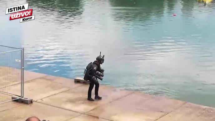 Britanski džet-ski letač Ričard Brauning u svom specijalnom džet-ski odelu, preleteo je preko jezera na Adi Ciganliji.