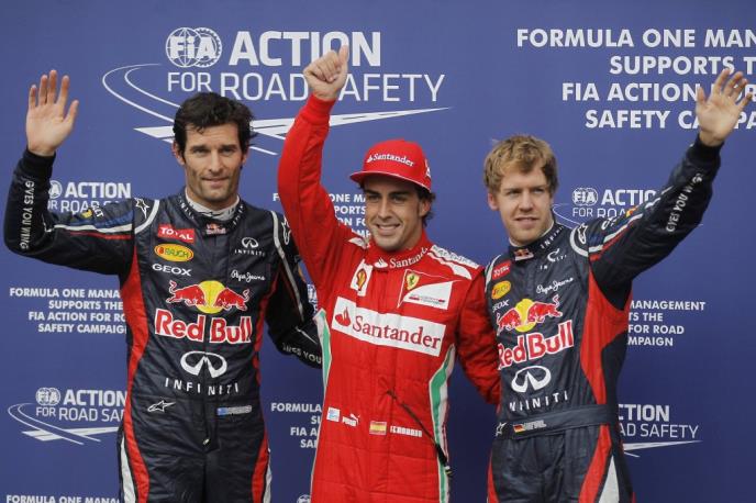 Alonso je do prve pozicije došao sa vremenom od jednog minuta, 40 sekundi i 621 stotinkom. Aktuelni svetski šampion i član Red Bula Sebastijan Fetel nedeljnu trku počeće sa druge pozicije.