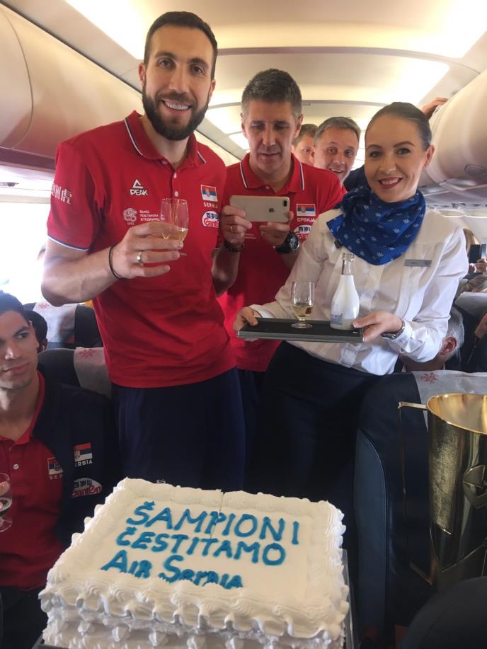 Šampione koji su sinoć, pobedom nad selekcijom Slovenije, trijumfovali u finalu Evropskog prvenstva pozdravio je kapetan uz opšte oduševljenje prisutnih putnika. Novi kontinentalni prvaci posluženi su šampanjcem i posebnom tortom a let je protekao u odličnoj atmosferi.