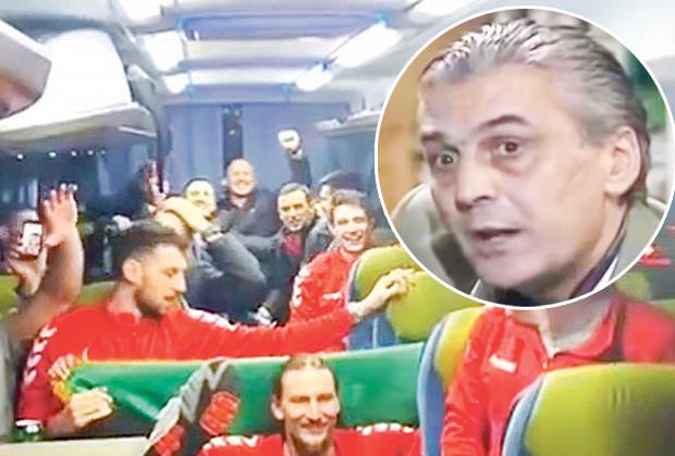 Nai­me, po­sle uta­k­mi­ce u su­bo­tu, u au­to­bu­su u ko­jem su bi­li ru­ko­me­ta­ši Cr­ne Go­re vi­jo­ri­la se ze­le­na za­sta­va, ko­ja je bi­la si­m­bol sled­be­ni­ka Kr­sta Po­po­vi­ća ko­ji su se 1918. go­di­ne po­bu­ni­li pro­tiv odlu­ke sku­p­šti­ne Cr­ne Go­re da se pri­klju­či za­jed­ni­ci sa Sr­bi­jom. U to­me je pred­nja­čio Ce­ti­nja­nin Mi­r­ko Ra­do­vić, ko­ji je bio ogr­nut ze­le­nom za­sta­vom, dok su Ale­k­san­dar Ba­kić i Ale­k­san­dar Gle­n­dža po­ka­zi­va­li ispru­že­ni pa­lac i ka­ži­pr­st.