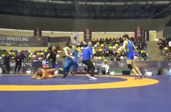 U meču između Gruzina Zuraba Erbotsanašvilija i Ukrajinca Kasana Zakarijeva, u kategoriji do 79 kilograma, došlo je do incidenta.