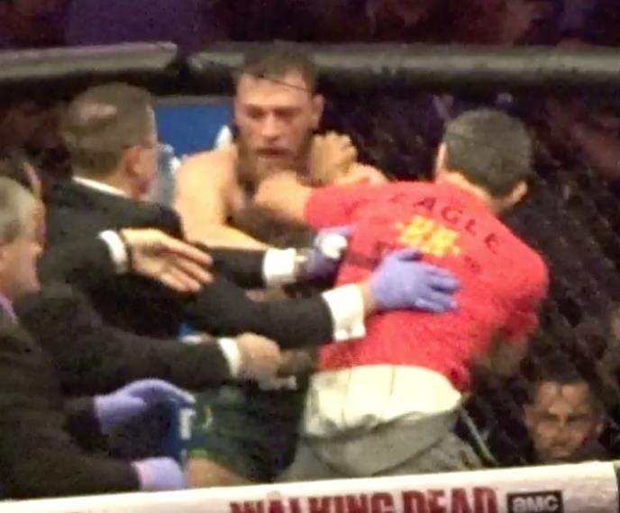 Habib je pre uručenja šampionskog pojasa preskočio kavez kako bi se obračunao sa Mekgregorovim trenerom Denisom. Haos se nastavio kada se član Habibovog tima popeo preko ograde i udario Mekgregora, koji se u momentu našao na udaru Habibovih ljudi.