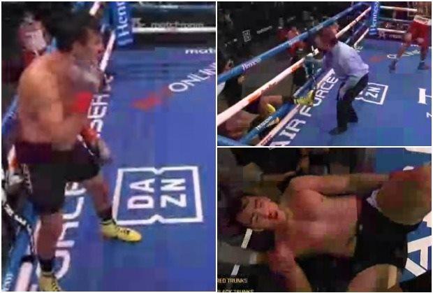 Sančez je iskoristio šansu i zadao mu snažan udarac u glavu, nakon kog je prepotentni bokser bukvalno izleteo iz ringa kroz konopce.