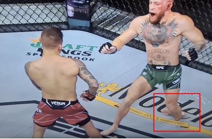 U samoj završnici prve runde Mekgregor je uspeo da se izvuče i ustane, međutim, na dve sekunde pre gonga noga mu je proklizala i potpuno se izvrnula. Verovatno je reč o prelomu levog skočnog zgloba.