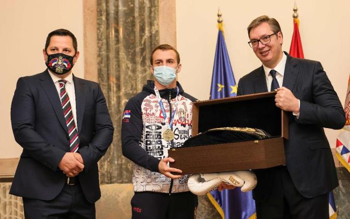 Predsednik Srbije Aleksandar Vučić upriličio je prijem za boksera Vladimira Mirončikova koji je na SP u Beogradu osvojio bronzanu medalju za Srbiju.