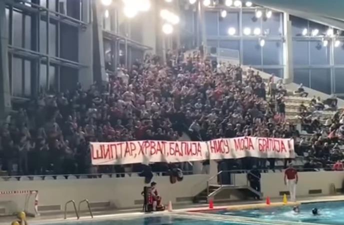 "Šiptar, Hrvat, balija, nisu moja bratija" pisalo je na sramnom transparentu koji je razvijen na tribinama bazena "Milan Gale Muškatirović", uz skandiranja Ratku Mladiću.
