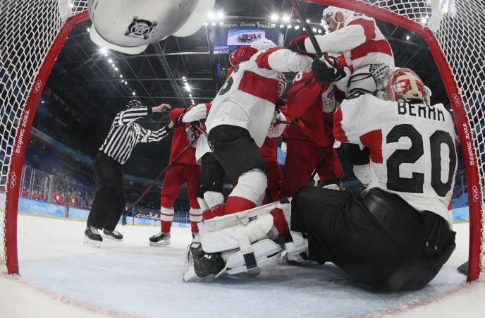 Golman švajcarske ekipe Reto Bera završio je u golu pošto je gurnut od strane hokejaša koji su pokušavali da dođu do paka. Jedni da se odbrane, a drugi da dođu do gola.