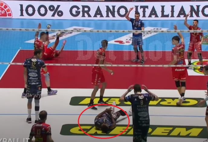 Kolioko je udarac bio jeziv dovoljno govori da je nesrećni odbojkaš ostao nepomično da leži na parketu.