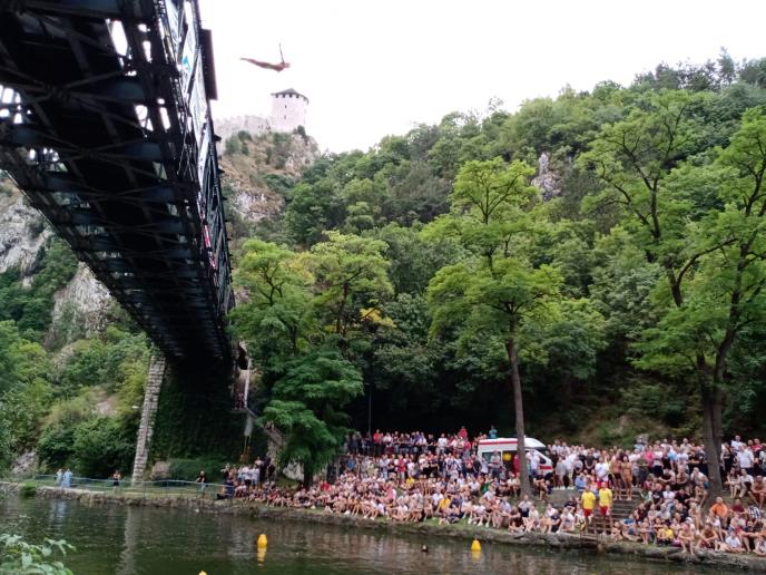 Pobednik u tradicionalnoj manifestaciji “Skokovi sa Starog železničkog mosta”, koja se održala danas na Gradskoj plaži u Užicu je Dušan Arsenić (23) iz Banjaluke, drugo mesto je zauzeo Evald Krnić (39) iz Tuzi i treće mesto je pripalo Dinu Bajriću (34) iz Sarajeva.