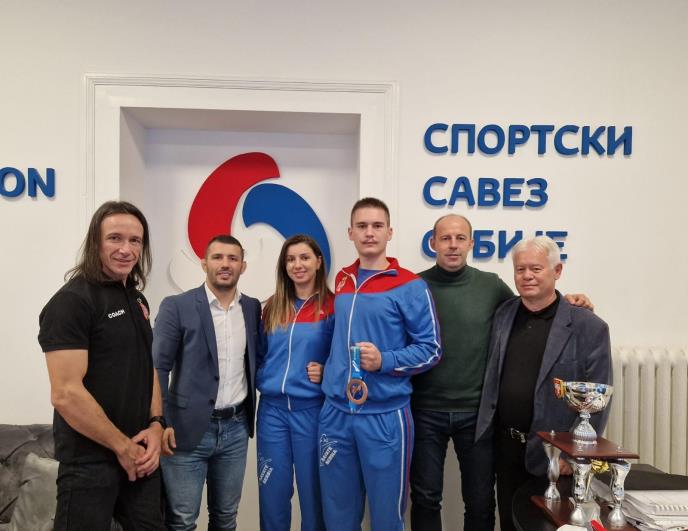 Pored osvajača medalja Kristine i Marka, predsednik Sportskog saveza Srbije Davor Štefanek i generalni sekretar Goran Marinković razgovarali su sa predsednikom Savate saveza Srbije Miodragom Rakićem i trenerom Miroslavom Odžićem.