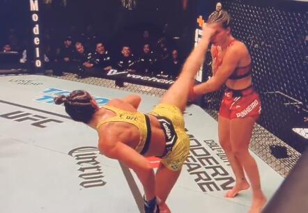 Najpre je rivaku udrmala silovitim udarcem desnom rukom u bradu. Nesrećna Pineiro se teturala po oktagonu i bilo je jasno da joj se bliži kraj u ovoj borbi. Usledio je spektakularan udarac iz okreta nogom pravo u glavu. Pineiro se odbila od kaveza i ostala na nogama, ali ne zadugo... Dobila je nekoliko novih udaraca pesnicom u lice, pala na zemlju, a onda se Amanda žestoko obrušila na nju. Mlatila ju je žestoko dok je ležala na podu, pa je sudija bio prinuđen da prekine borbu.