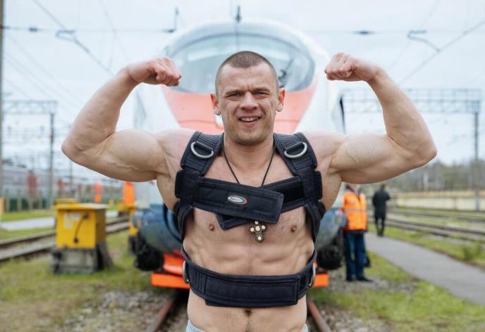 Denis Vovk je na pruzi u drugom po veličini gradu u Rusiji, uspeo da za 37 sekundi pomeri voz za 1,48 metara i time postavi novi najbolji rezultat. Ovaj ruski snagator ima manje od 90 kilograma.