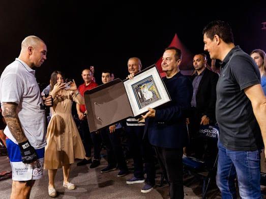 Profi reviju "Trofej Vidovdana" je podržao i ministar Ivica Dačić kome je Marko Nikolić uručio i poklon ikonu belog anđela.