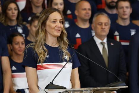 "Želim da izrazim zadovoljstvo što je Dušanu i meni pripala čast da budemo nosicoci zastave. Biti predvodnik ove ekipe predstavlja čast i zadovoljstvo i hvala vam na tome. Hvala državi u ime celog tima, jer nam je omogućila najbolje uslove. Hvala ministru sportu, našim savezima, detalji su ove godine bili na visokom niovu. Nadam se se ćemo uspeti da nadmašimo uspehe iz Tokija i da ćemo na tom putu imati podršku", rekla je srpska odbojkašica.