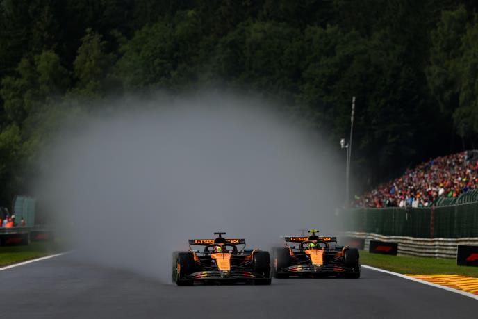 Trka u Belgiji je startovala 80 minuta kasnije od predviđenog vremena zbog jake kiše. Prva četiri kruga su voženja iz bezbednosnog vozila, pre nego su bolidi dobili zeleno svetlo. Ubrzo zatim Pjastri je prestigao klubskog kolegu Norisa koji je imao pol poziciju.