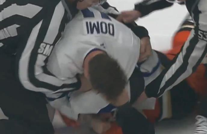 Maks Domi iz Toronta i Radko Gudas iz Anahajma su, čim je startovao meč, bacili rukavice i započeli tučnjavu i pesničenje.