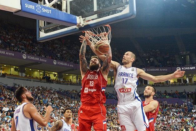 Startne petorke - Srbija: Marković, Bogdanović, Kalinić, Birčević, Raduljica; Francuska: Ertel, De Kolo, Batum, Dijao, Gober.