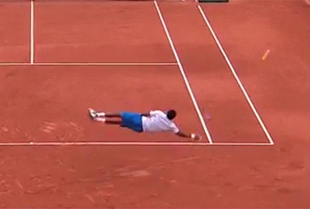 Monfis je u trećem setu odlučio da se baci na jednu loptu i da pokuša da kao fudbalski golman paradom zaradi poen.
