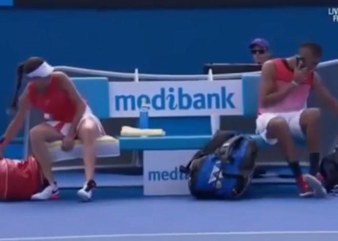 Kirjos je pred početak miks dubla u kome je nastupio sa Ajlom Tomljanović protiv Ivana Dodiga i Sanije Mirze, seo na klupu i javio se na telefon koji je izvadio iz džepa.