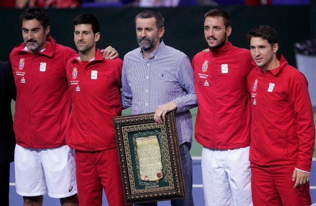 Pre duela dublova Srbije i Rusije u prvom kolu Dejvis kupa, predsednik Teniskog saveza Srbije Mirko Petrović je uručio specijalno priznanje doskorašnjem selektoru Bogdanu Obradoviću.