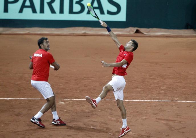 Francuski teniseri Pjer Hužes Herbert i Nikolas Mahut savladali su Filipa Krajinovića i Nenada Zimonjića sa 3:0 u setovima (6:1, 6:2, 7:6) u dubl meču polufinala Dejvis kupa, pa Francuzi nakon dva dana vode sa 2:1.