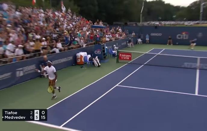 Pri rezultatu 6:2, 5:4 za Medvedeva Amerikanac je sjajno napao i zatim poslao lopticu tamo gde protivnika nije bilo. Tiafo je laganim korakom, leđima okrenut terenu, počeo da slavi poen.
