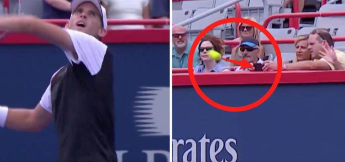 Austrijski teniser Dominik Tim je ne baš jakim volejem pogodio direktno u mobilni telefon gledateljke, naspram sebe, koja se ovako nečemu nije nadala.