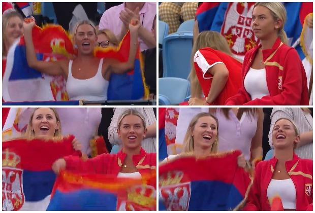 Kamere su često zumirale prelepu plavušu koja je, ogrnuta srpskom zastavom, pružala glasnu podršku Dušanu Lajoviću i Novaku Đokoviću koji su izborili finale.