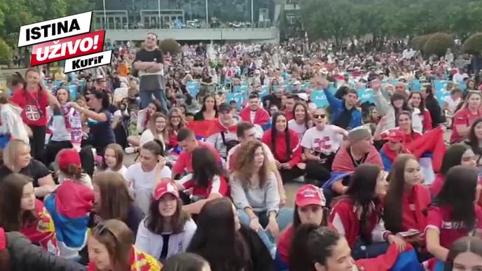 Navijači, ogruniti srpskom trobojkom, spremni su za gromoglasno navijanje.