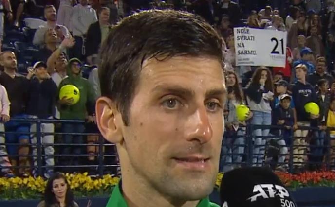 Posle meča, dok je Novak davao izjavu za medije, u pozadini mogao je da se vidi transparent koji je svima zapao za oko, a na kome je pisalo: