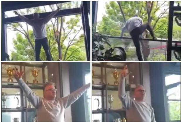 Na snimku se može videti kako Srđan diže tri prsta, penje se na prozor i peva iz sveg glasa!