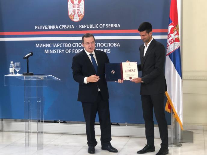Ministar spoljnih poslova Ivica Dačić uručio je danas nagradu teniseru Novaku đokoviću za izuzetan lični angažman i doprinos u promociji interesa Srbije i njenog naroda u svetu, saopštilo je ministarstvo.