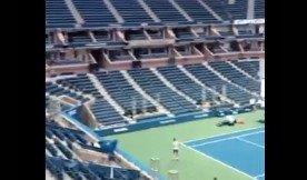 Na sablasno praznom Artur Ešu, u potpunoj tišini, odradio je trening. Sve to je krišom snimo Tom Hil, trener grčke teniserke Marije Sakari.