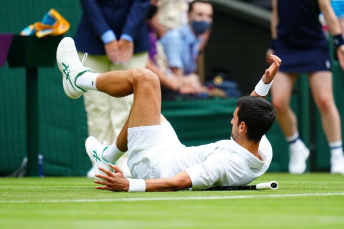 Novak je nekoliko puta proklizavao i završavao na travi. Videlo se da je nervozan zbog toga, gunđao je i širio ruke, a verovatno će i po završetku meča ponovo o tome govoriti.