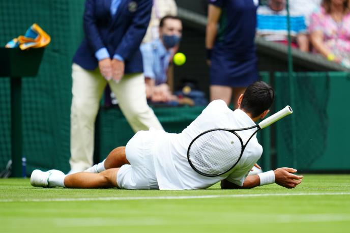 Teniseri se sve više ljute zbog proklizavanja, Novak Đoković vidno je bio nervozan nakon jednog od mnogih padova, pogotovo jer nije potrebno da igrač napravi neki nagli pokret, već samo da malo brže potrči i već je na travi!