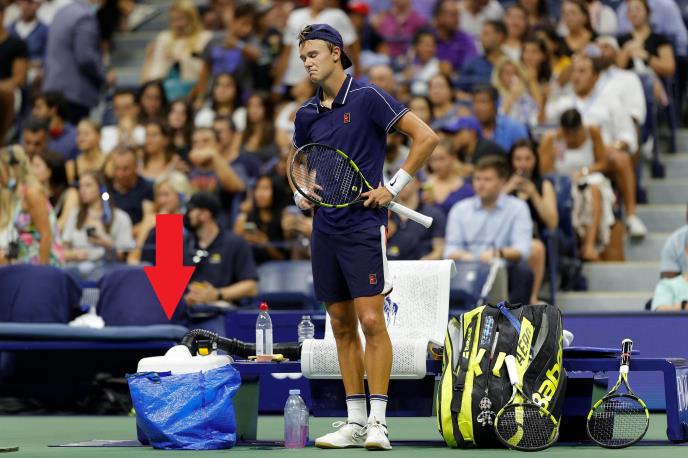 Malo neobično za tenisere da na teren iznesu i nešto drugo osim sportske torbe i rekvizita potrebnih za igru, a mladi Danac je poneo i plavi ceger koji je privukao posebnu pažnju.