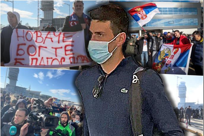 Navijači ispred zgrade aerodroma "Nikola Tesla" i dalje čekaju Novaka Đokovića. Sa zastavama i transparentima.