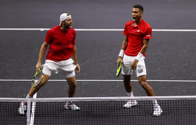 Kanadski teniser Feliks Ože-Alijasim i njegov partner u dublu Amerikanac Džek Sok pobedili su danas u Londonu italijansko-britanski par Matea Beretinija i Endija Mareja posle tri seta, 2:6, 6:3, 10:8, posle čega je Tim Sveta smanjio na 7:8 protiv Tima Evrope na Lejver kupu.