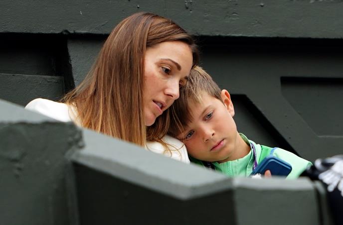 Tako su Stefan i Jelena u Novakovoj loži tražili na telefonu nešto zanimljivo. Stefan se naslonio na majčino rame dok mu je ona pokazivala nešto na mobilnom aparatu.