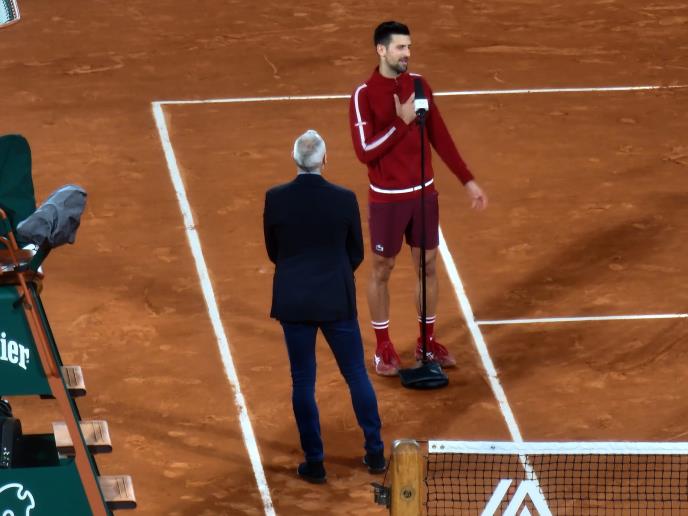 - Hvala puno, hvala. Dakle, pokušaću na francuskom, zaslužujete to. Šta mogu reći, moram da kažem respekt velikom ratniku Musetiju za meč koji je bio igran ovako kasno ili rano ujutru. Ali rekao sam mu na kraju meča da je ovo neverovatno, bio je spreman da pobedi, prišao je vrlo blizu. Mogu reći da je on bio bolji na početku četvrtog seta, nisam imao rešenja za njegovu igru, odlično je igrao, sve što je radio je radio sa velikim kvalitetom. Bilo je to jako teško. Moram reći hvala vama jer ste mi dali energiju u četvrtom setu, bio sam drugi igrač zbog vas. Ovo je nevrovatno da ste ostali. Tri ujutru. Mnogo dece koja treba da spavaju, koji su mladi. Ali hvala vam, hvala za najlepši meč sa najviše uzbuđenja koji sam igrao ovde. Hvala! Toliko adrenalina imam, ako imate neku žurku, dolazim, pravimo je.