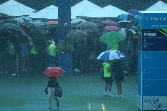 Jaka kiša sa vetrom saterala je svakog ko je do tada bio na otvorenom da potraži kakav god zaklon im se ukazivao, dok su takmičari na 7 otvorenih terena pobegli glavom bez obzira u svlačionice, prepustivši borilišta barama. Time je automatski bio pomeren do daljnjeg i očekivani važni trening Novaka Đokovića na terenu 16, koji za tu priliku poprimi ambijent srpske proslave, što će svakako biti mnogo manja šteta za današnij program čak i ako se nastavi sa igrom oko tri sata popodne (po najavama organizatora).