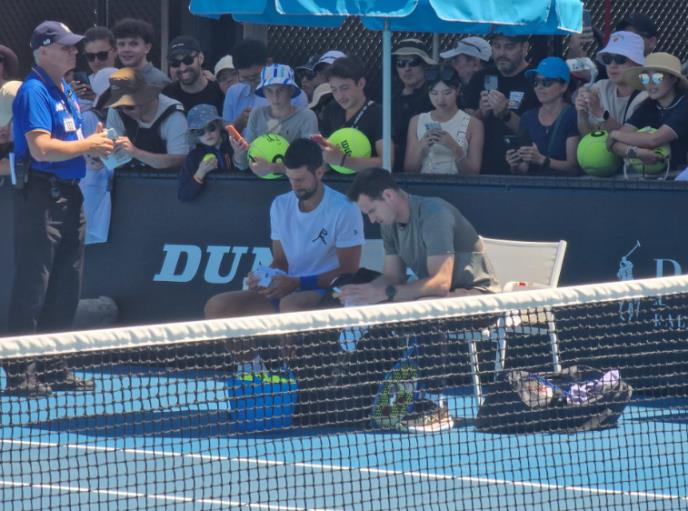 Tek negde oko 14:30 je Novak ugledan na "sedamnaestici", praćen velikim aplauzom, i podjednako velikim kada se tu pojavio i “kouč” Endi Marej. “Endi, volim te!” čulo se nekoliko puta iz publike, na šta Škot nije ni obrvom reagovao, dok je u sebi Novak verovatno bio dodatno srećan izborom trenera koji će na sebe prebaciti jedan deo tih i takvih izliva obožavanja. I pre nego što su se latili reketa, krenulo je da se radi sa još manjom lopticom od teniske.