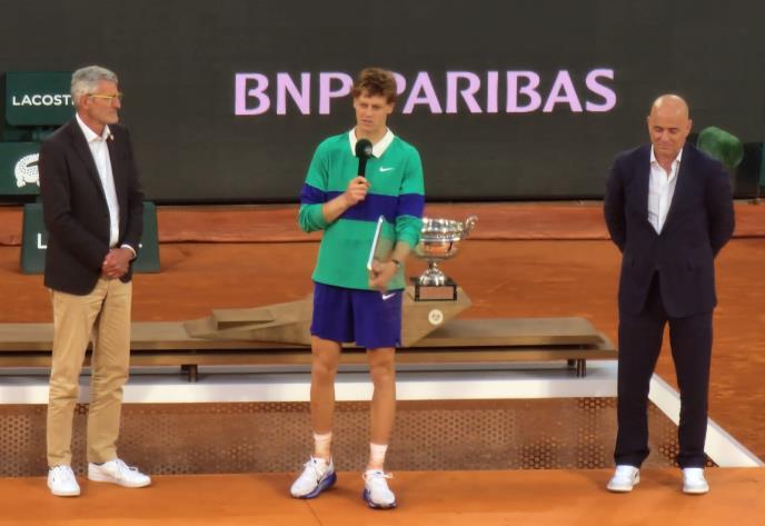 "Zdravo svima, Karlose, čestitam ti na sjajnoj igri, bici, zaslužio si, čestitam tebi i tvom timu. Lakše je igrati nego pričati. Hvala mom timu koji me doveo u ovu poziciju, probali smo, dali smo sve od sebe. Pre nekog vremena bih potpisao da budem ovde. Teško je, ali je okej… hvala skupljačima loptica, olakšavate nam život. Hvala svima, Pariz je posebno mesto za mene. Srećan sam zbog ovog sjajnog trofeja. Neću spavati večeras, ali je u redu. Hvala ljudima u organizaciji, osećamo se kao kod kuće. Podrška je bila sjajna tokom celog turnira, sjajni ste. Vidimo se dogodine”