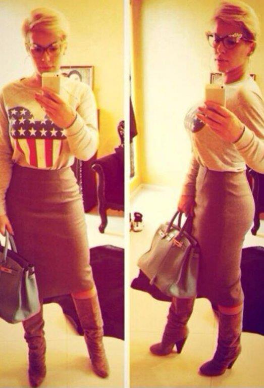 Svoj novi imidž pevačica je upotpunila ekscentričnim naočarima za vid, dužom uskom suknjom, duksom sa motivom američke zastave i damskom torbom.